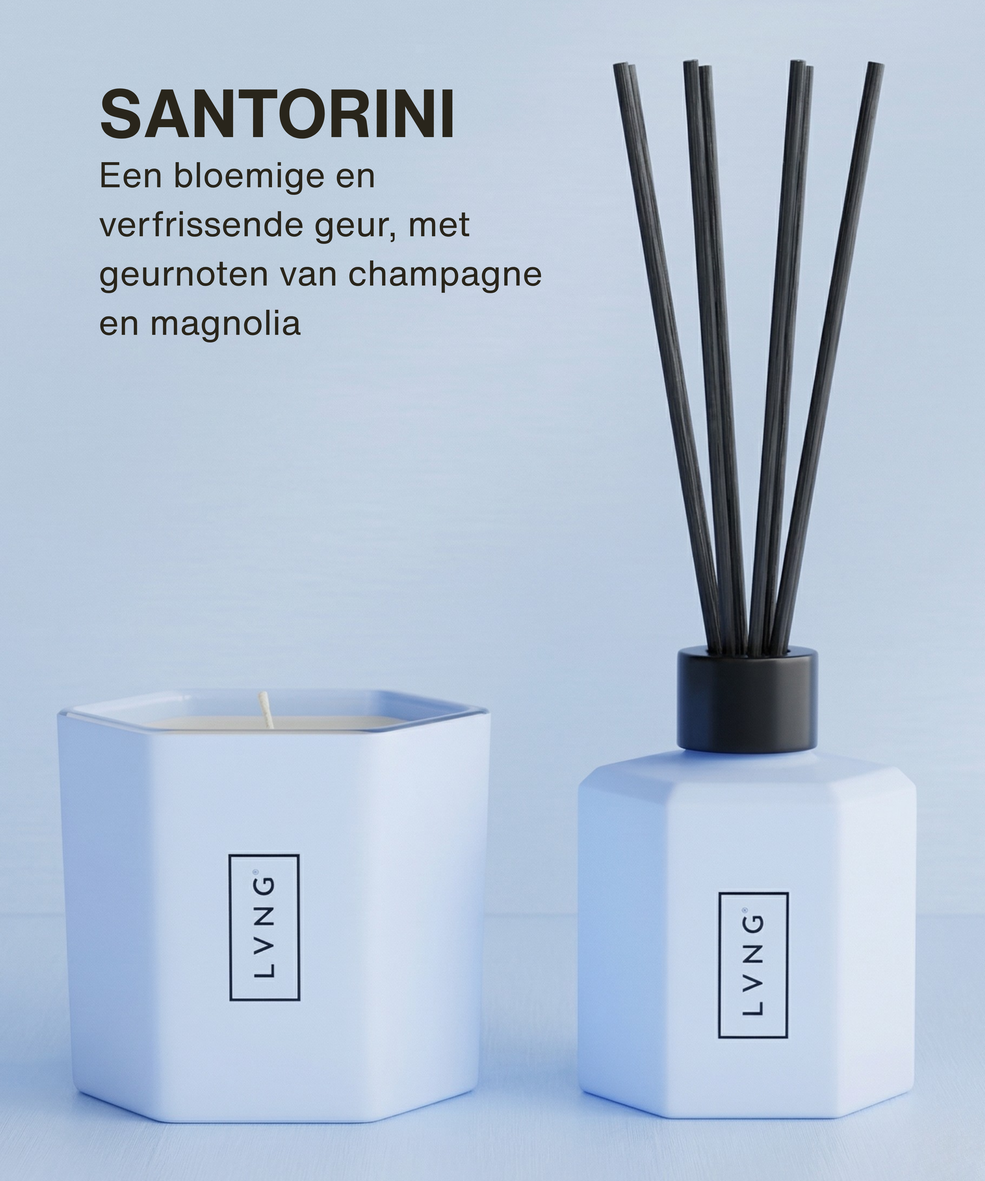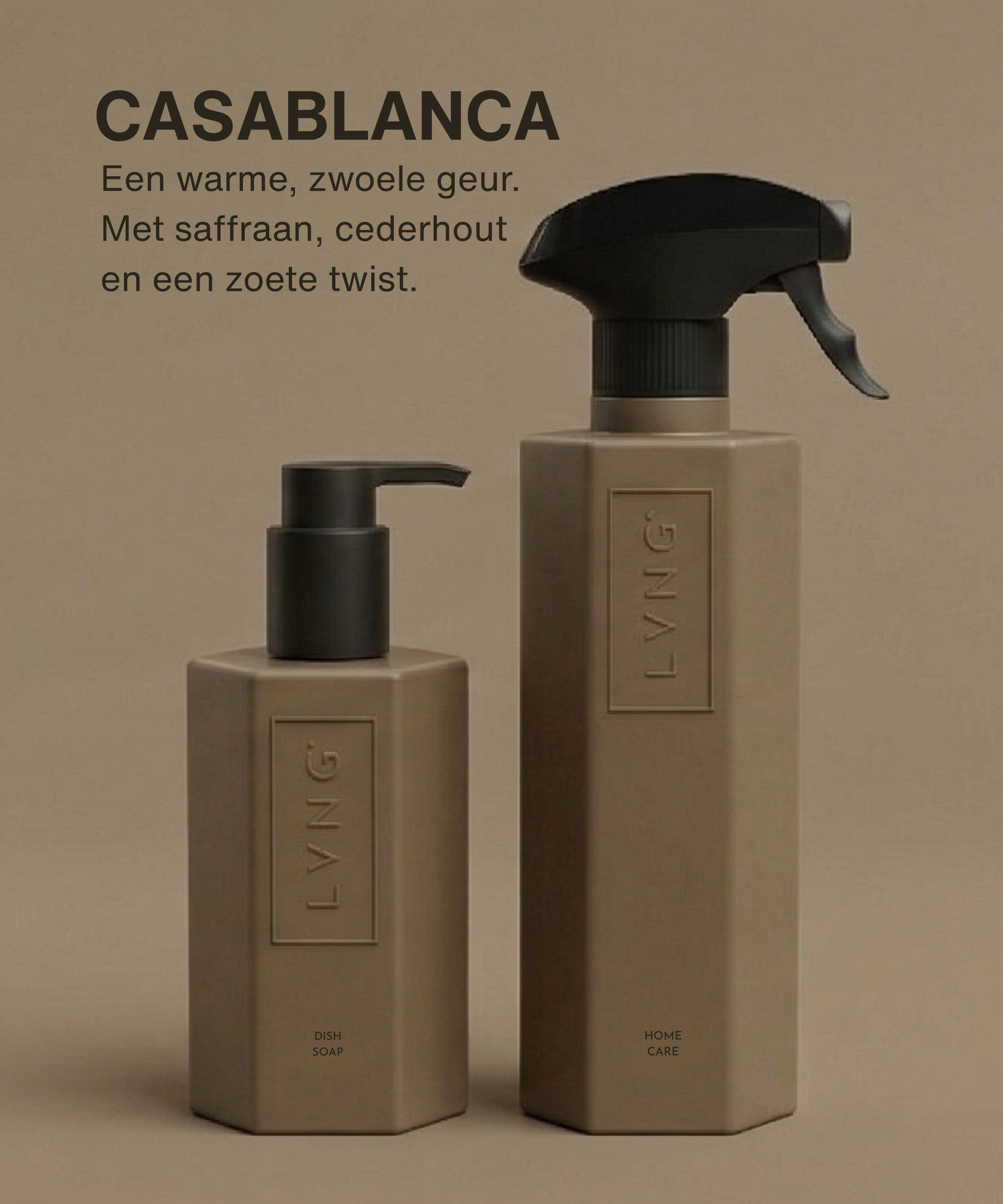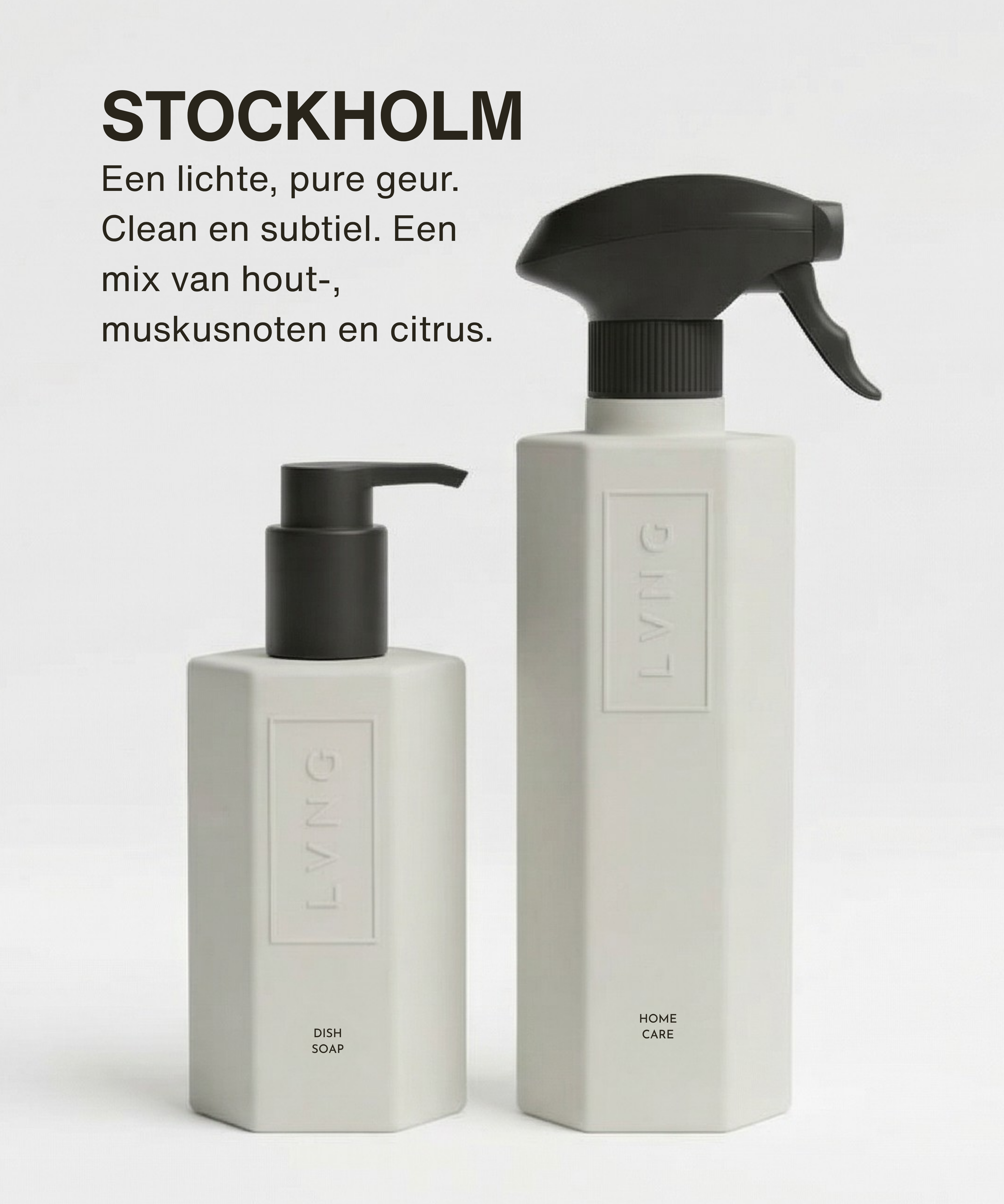 geur in ieder verzorgings- en schoonmaakproduct, zodat alle geuren in huis worden verenigd tot één geureenheid. Steeds bewust kiezend voor natuurlijke ingrediënten, recyclebare grondstoffen en verantwoorde productie. Een no-nonsense attitude die ervoor zorgt dat een LVNG-product een toegevoegde waarde vormt in elk interieur en een minimale impact heeft op het milieu. Ongekunsteld, waardoor alleen het essentiële overblijft en er ruimte is voor dat wat er echt toe doet.